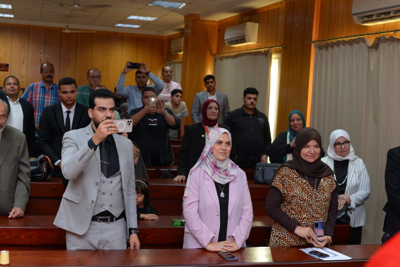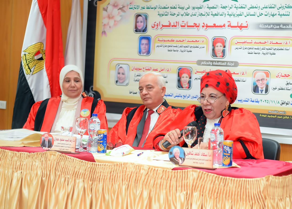 عقد قطاع الدراسات العليا بالكلية مناقشة الطالبة نهلة مسعود الدفراوي المسجلة لدرجة دكتوراه الفلسفة في التربية تخصص مناهج وطرق تدريس تكنولوجيا التعليم في موضوع :ـ "تصميم الكتاب الإلكتروني التفاعلي ونمطي التغذية الراجعة (النصية / الفيديو) في بيئة تعلم متعددة الوسائط عبر الإنترنت لتنمية مهارات حل المسائل الفيزيائية والدافعية للإنجاز لدى طلاب المرحلة الثانوية".