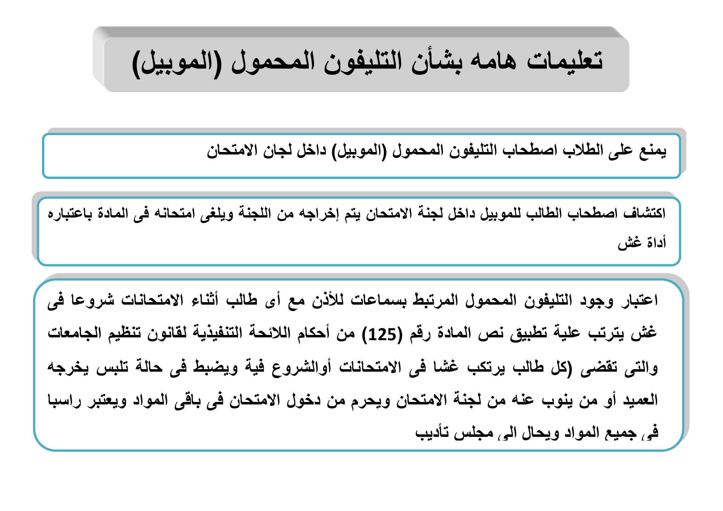 يُحظر اصطحاب الهواتف المحمولة داخل لجان الامتحانات.