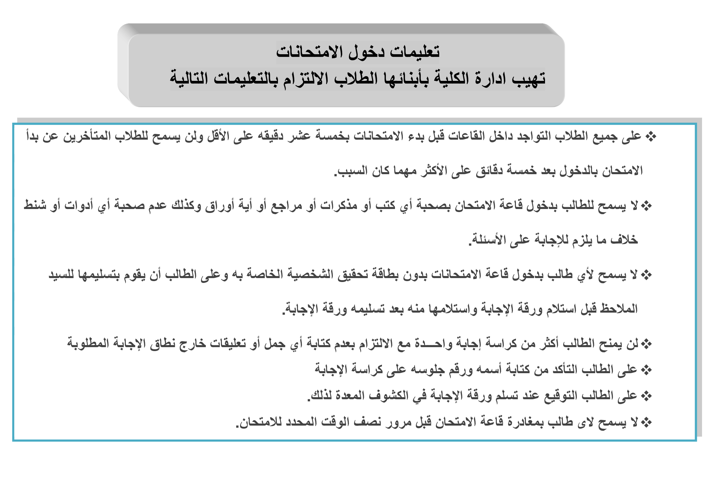 التواجد داخل لجان الامتحانات قبل موعد بدء الامتحان بخمسة عشر دقيقة على الأقل، ولن يُسمح بدخول أي طالب بعد بدء الامتحان.