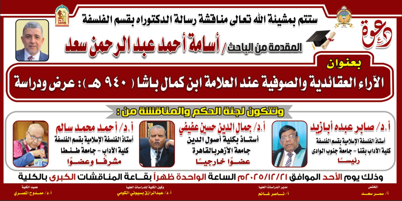شهدت كلية الآداب بجامعة طنطا مناقشة رسالة الدكتوراة المقدمة من الباحث "أسامة أحمد عبد الرحمن سعد" بقسم الفلسفة، بعنوان "الآراء العقائدية والصوفية عند العلامة ابن كمال باشا": عرض ودراسة.
