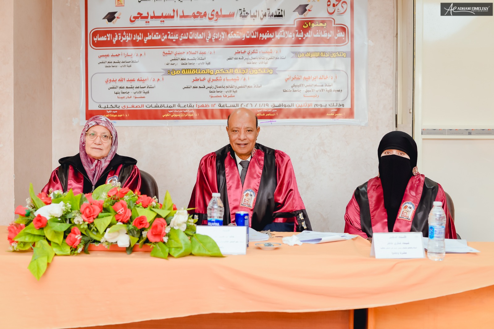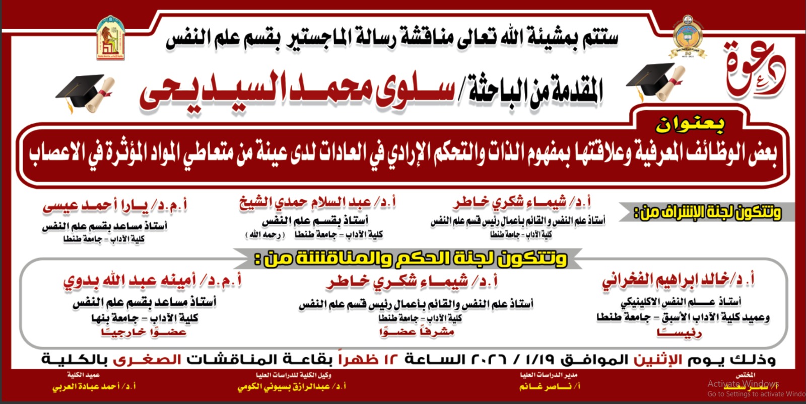 وتتكون لجنة الحكم والمناقشة برئاسة الأستاذ الدكتور خالد إبراهيم الفخراني، أستاذ علم النفس الإكلينيكي وعميد الكلية الأسبق "رئيساً"، والأستاذة الدكتورة شيماء شكري خاطر، أستاذ بقسم علم النفس والقائم بأعمال رئيس القسم بالكلية "مشرفاً وعضواً"، والدكتورة أمينة عبدالله بدوي، أستاذ مساعد بقسم علم النفس بكلية الآداب جامعة بنها "عضواً خارجياً" وذلك بقاعة المناقشات الصغرى بالكلية.
