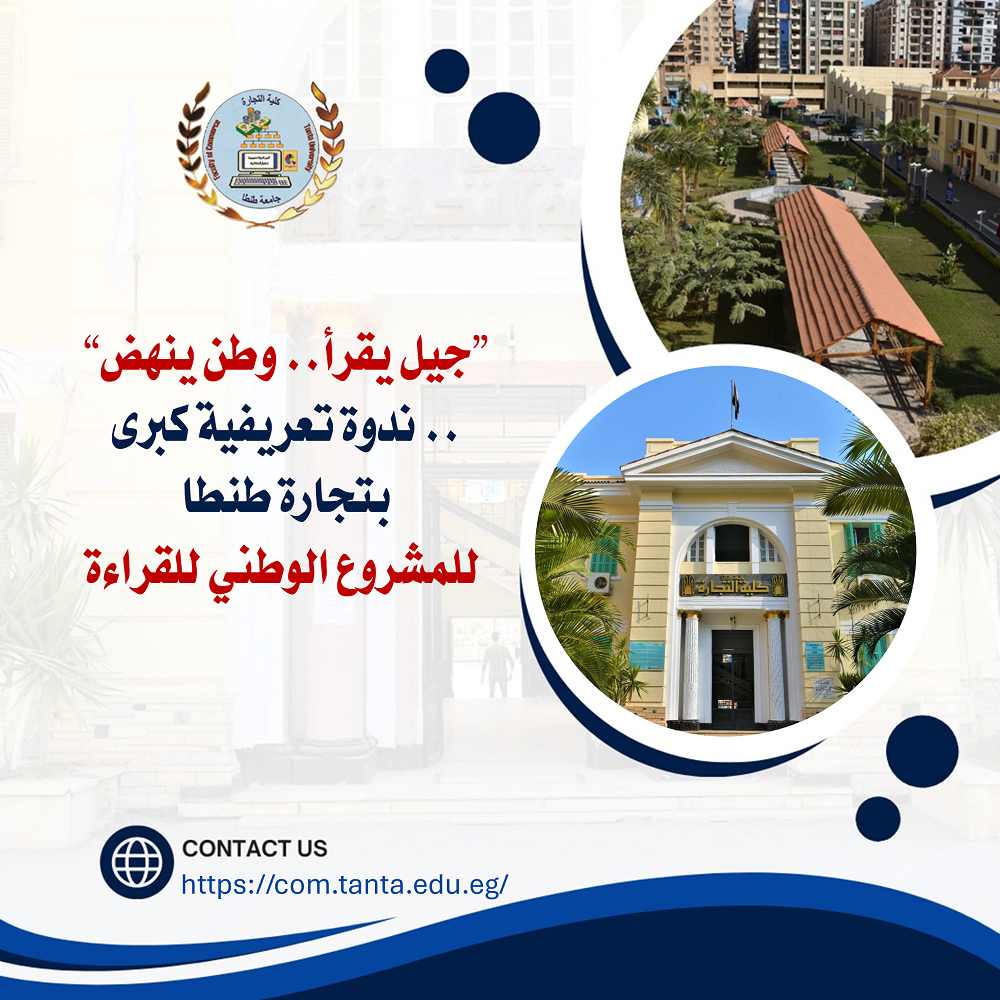 تحت شعار "مصر بألوان المعرفة"، وفي إطار دعم الثقافة وبناء الوعي الطلابي، تدعو كلية التجارة جامعة طنطا أبنائها الطلاب لحضور الندوة التعريفية الأولى للمشروع الوطني للقراءة في دورته الخامسة، للتعريف بكيفية الوصول إلى لقب "الطالب الجامعي المثقف"، تحت رعاية الأستاذ الدكتور محمد حسين، رئيس جامعة طنطا، و الأستاذ الدكتور السيد العجوز، نائب رئيس الجامعة لشئون التعليم والطلاب، و الأستاذ الدكتور محمود سليم، نائب رئيس الجامعة لشئون خدمة المجتمع وتنمية البيئة، والأستاذ الدكتور ياسر الجرف، عميد الكلية، والأستاذ الدكتور/ طارق رضوان، وكيل الكلية لشئون التعليم والطلاب، وبالتنسيق مع الاستاذ الدكتور محمد إبراهيم طه (منسق الجامعة)، والدكتور غادة نبيل (منسق الكلية).
