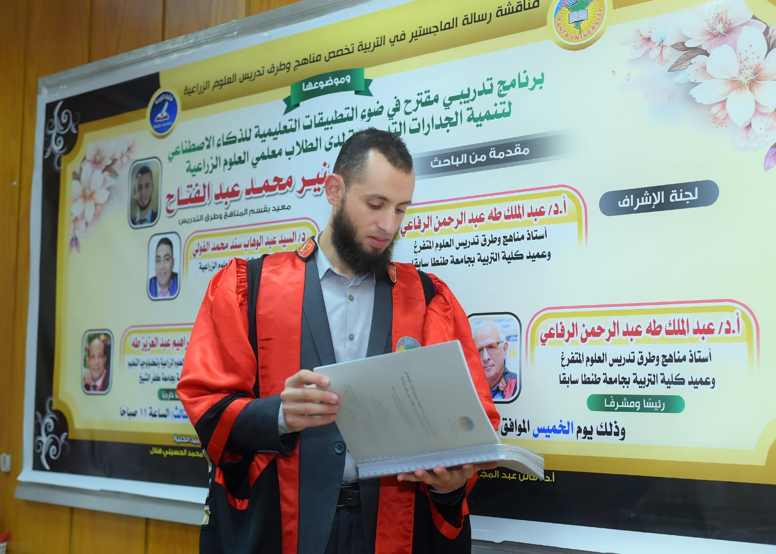 عقد قطاع الدراسات العليا بالكلية مناقشة رسالة الماجستير المقدمة من الباحث محمد منير محمد عبد الفتاح، المسجل لدرجة الماجستير في التربية تخصص مناهج وطرق تدريس العلوم الزراعية، وذلك في موضوع: "برنامج تدريبي مقترح في ضوء التطبيقات التعليمية للذكاء الاصطناعي لتنمية الجدارات التدريسية لدى الطلاب معلمي العلوم الزراعية".